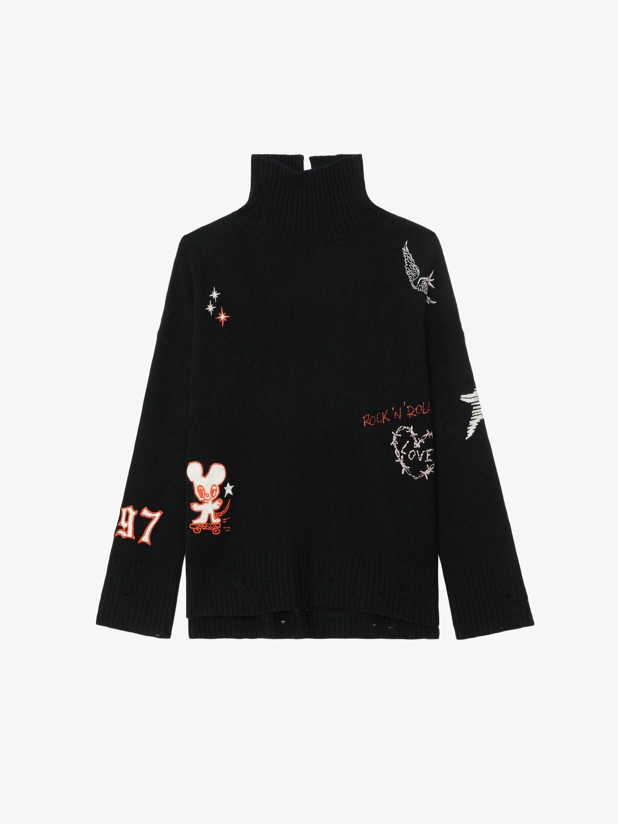 High-neck sweater with worn effect and intarsia. Description & details - Sweater in 100% cashmere - Multicustomisation jacquard pattern - High neck - Long sleeves - ZV logo This item has a loose fit. For a more fitted look, choose one size down from your usual size. Composition 100% Cashmere Care - Hand-wash or machine-wash on a 20°C wool cycle with a maximum spin speed of 400 rpm - Do not wring - Air dry flat - Iron inside out at a maximum of 110°C, avoiding any customised details Product code: KWSW02868_BLACK