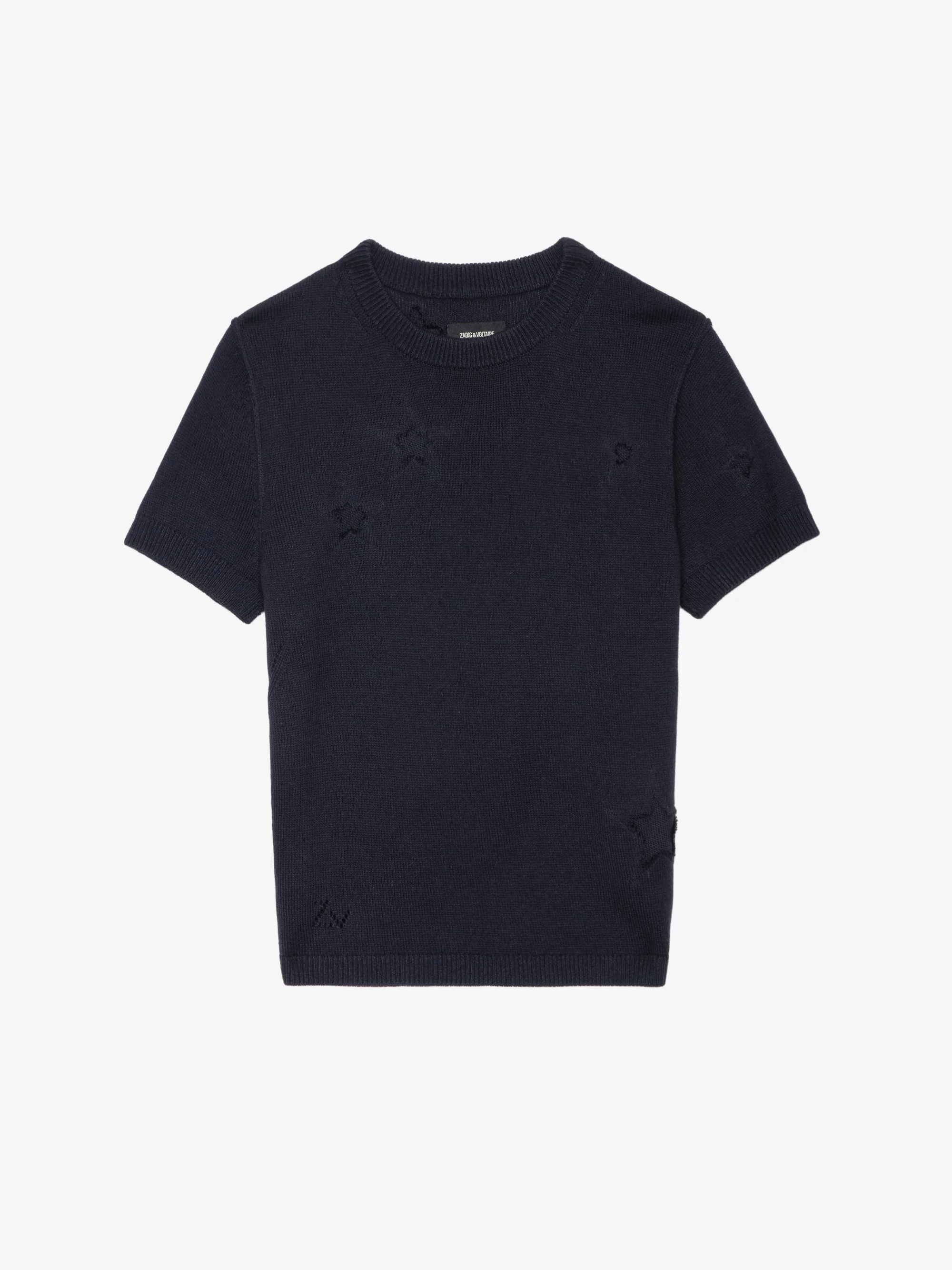 Round neck sweater with distressed star intarsia. Description & details - Silk and cashmere sweater - Jacquard intarsia pattern with worn-effect stars - Round neck - Short sleeves, ribbed edges and ZV signature pointelle This item is true to size. We recommend buying your usual size. Composition 47% Cotton** 45% Silk 8% Cashmere Care - Hand-wash or machine-wash on a 20°C wool cycle with a maximum spin speed of 400 rpm - Do not wring - Air dry flat - Iron inside out at a maximum of 110°C, avoiding any customised details Product code: KWSW02691_ENCRE