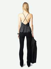 Lingerie-style black satin camisole in Japanese satin with pleated details and adjustable cross-back straps. Description & details - Women's Japanese black satin camisole slip top in lingerie style - V-neckline and back adorned with pleated details - Thin, crossed, and adjustable straps Model is 177 cm / 5' 9" and is wearing a size S This item is true to size. We recommend buying your usual size. Composition 57% Polyester** 43% Polyester Care - Hand-wash or machine-wash inside out in a mesh laundry bag on a 20°C delicate cycle with a maximum spin speed of 400 rpm - Air dry flat - Iron inside out at a maximum of 110°C Product code: WWCR01256_BLACK
