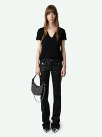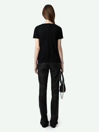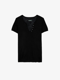 Short-sleeved feather cashmere Henley sweater with wings embroidered on the back and distressed-effect edges. Description & details - Women’s black feather cashmere sweater - Henley T-shirt with 5 buttons on a round neck - Short sleeves and ribbed edges with distressed effect - Signature wings embroidered on the back - Naturally warm feather cashmere is lighter and more delicate than traditional cashmere. It offers a finer knit, making this an exceptional piece. This item is true to size. We recommend buying your usual size. Composition 100% CASHMERE Care - Hand-wash or machine-wash on a 20°C wool cycle with a maximum spin speed of 400 rpm - Do not wring - Air dry flat - Iron inside out at a maximum of 110°C, avoiding any customised details Product code: KWSW01671_NOIR