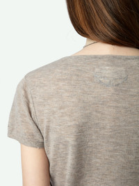 Short-sleeved feather cashmere Henley sweater with wings embroidered on the back and distressed-effect edges. Description & details - Women’s Latte brown feather cashmere sweater - Henley T-shirt with 5 buttons on a round neck - Short sleeves and ribbed edges with distressed effect - Signature wings embroidered on the back - Naturally warm feather cashmere is lighter and more delicate than traditional cashmere. It offers a finer knit, making this an exceptional piece. This item is true to size. We recommend buying your usual size. Composition 100% CASHMERE Care - Hand-wash or machine-wash on a 20°C wool cycle with a maximum spin speed of 400 rpm - Do not wring - Air dry flat - Iron inside out at a maximum of 110°C, avoiding any customised details Product code: KWSW01671_LATTE