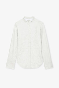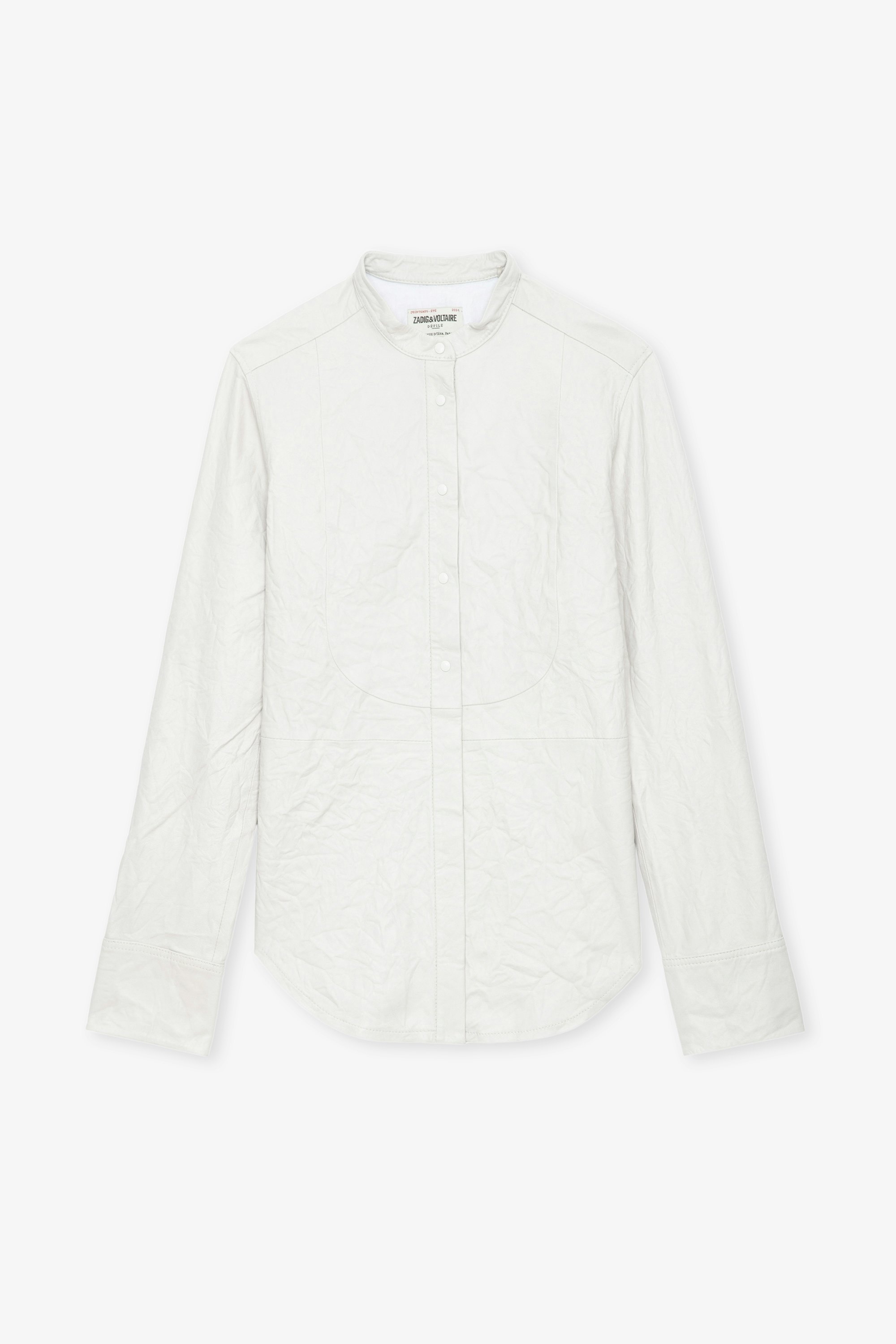 White crinkled leather shirt with press studs. Description & details - Women's Judo white crinkled leather shirt - Mandarin collar and long sleeves - Overstitching - Button placket and press stud cuffs - Zadig&Voltaire’s signature material, crinkled leather is obtained by means of a multi-step process developed by the brand, guaranteeing a unique product that showcases exceptional know-how. Model is 178 cm / 5' 10" and is wearing a size S This item is true to size. We recommend buying your usual size. Composition 100% LAMBSKIN Care This garment should be cared for by a leather professional. Product code: RWSH00028_JUDO