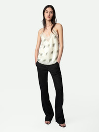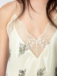 Ecru lingerie-style camisole with floral print, sequins, thin straps and lace-trimmed neckline. Description & details - Women’s Mastic ecru lingerie-style camisole - Floral print and tone-on-tone sequins - Lace trim - Thin non-adjustable straps Model is 177 cm / 5' 9" and is wearing a size S This item is true to size. We recommend buying your usual size. Composition 100% POLYESTER Care - Hand-wash or machine-wash inside out in a mesh laundry bag on a 20°C delicate cycle with a maximum spin speed of 400 rpm - Air dry flat - Iron inside out at a maximum of 110°C Product code: WWCR00241_MASTIC