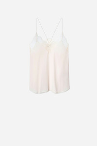 Silk and lace camisole Description & details This Zadig&Voltaire must-have is reinvented every season: the signature Christy camisole can be worn under a blazer or on its own for a chic, bohemian look. - Zadig&Voltaire women’s ecru silk camisole - Straight neckline - Contrasting patterned lace - Thin straps Model is 180 cm/5'11" and is wearing a size S Model is 180 cm / 5' 10" and is wearing a size S This item is true to size. We recommend buying your usual size. Composition 100% SILK Care - Hand-wash or machine-wash inside out in a mesh laundry bag on a 68°F delicate cycle with a maximum spin speed of 400 rpm - Air dry flat - Iron inside out at a maximum of 230°F Product code: PWGCP0702F_ECRU
