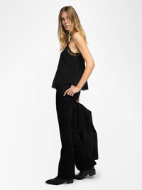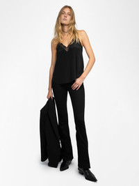 Women's silk camisole with lace trim. Description & details - Silk camisole - Contrast lace patterned collar - Thin adjustable straps Model is 180 cm / 5' 10" and is wearing a size S This item fits true to size. Choose your usual size. Composition 100% Silk Care - Hand-wash or machine-wash inside out in a mesh laundry bag on a 20°C delicate cycle with a maximum spin speed of 400 rpm - Air dry flat - Iron inside out at a maximum of 110°C Product code: WWCR01313_BLACK