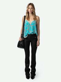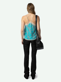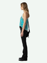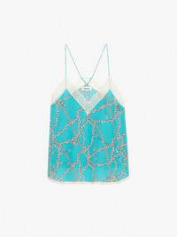 Blue lingerie-style silk camisole with ZV chain motifs, thin straps and lace neckline. Description & details - Women’s Aqua blue lingerie-style silk camisole - Chain and ZV signature motifs and lace edging - Thin non-adjustable straps This French lace was made by Sophie Hallette exclusively for Zadig&Voltaire. Model is 175 cm / 5' 8" and is wearing a size S This item is true to size. We recommend buying your usual size. Composition 100% SILK Care - Hand-wash or machine-wash inside out in a mesh laundry bag on a 20°C delicate cycle with a maximum spin speed of 400 rpm - Air dry flat - Iron inside out at a maximum of 110°C Product code: WWCR00245_AQUA
