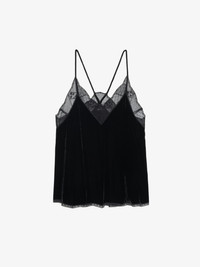 Black velvet camisole with lace trim. Description & details - Women's lingerie-style black velvet camisole - Lace trim - Thin, non-adjustable straps This item fits true to size. Choose your usual size. Composition 80% Viscose** 20% Silk Product code: WWCR01319_BLACK