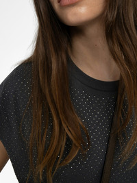 Sleeveless round neck t-shirt with rhinestones. Description & details - Tank top in 100% cotton - Rhinestones - Round neckline Model is 178 cm / 5' 10" and is wearing a size XS/S This item fits true to size. Choose your usual size. Composition 100% Cotton** Care - Machine-wash inside out on a 30°C delicate cycle with similar colours - Air dry - Iron inside out at a maximum of 110°C, avoiding any customised details Product code: JWTT01288_MEDIUM GREY