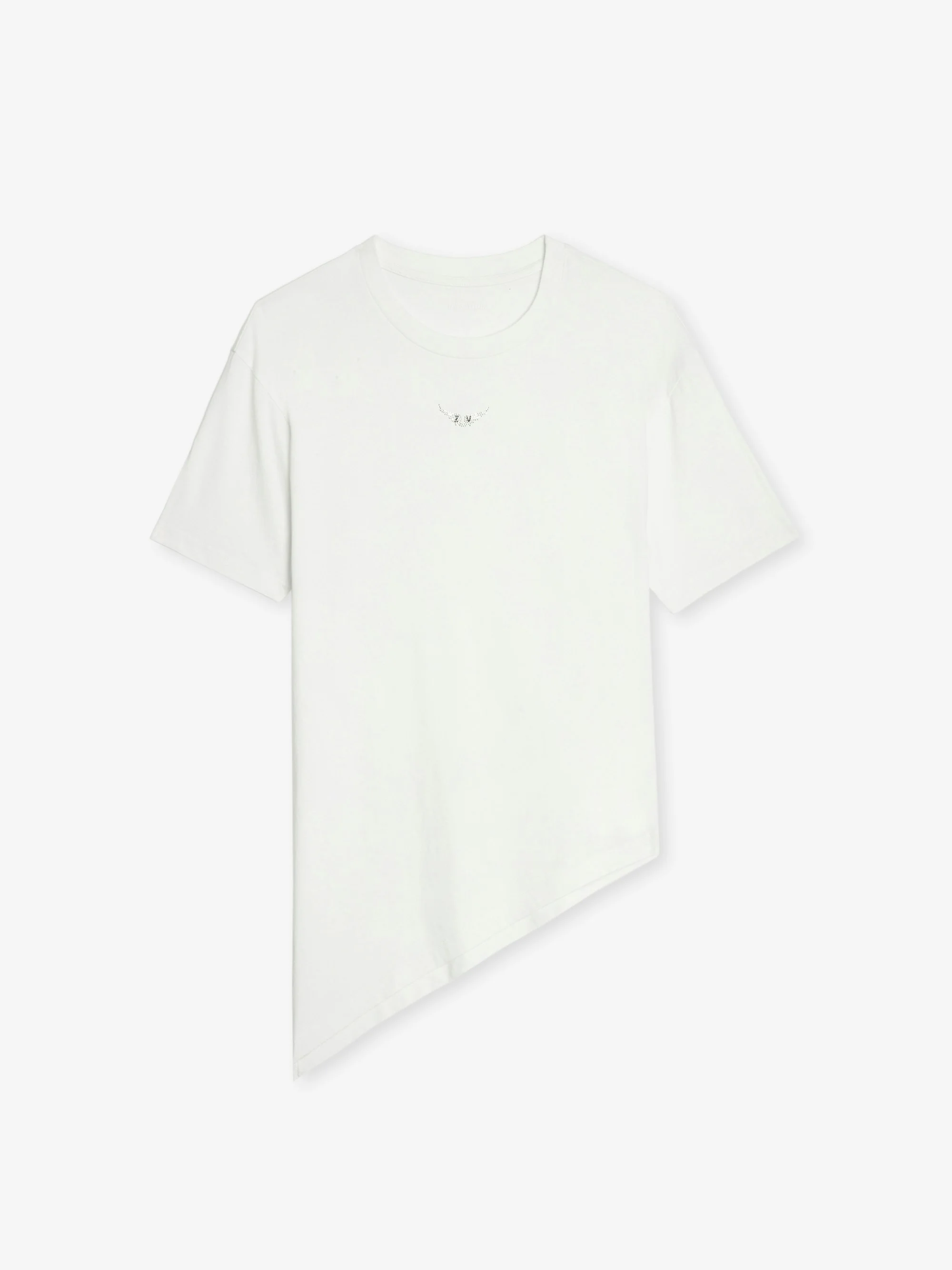 Asymmetric short-sleeved T-shirt with rhinestones on the front. Description & details - T-shirt in 100% cotton - Asymmetric cut - Rhinestone wing signature on the front - Short sleeves - Round neck Model is 175 cm / 5' 8" and is wearing a size S This item has a loose fit. For a more fitted look, choose one size down from your usual size. Composition 100% Cotton* Care - Machine-wash inside out on a 30°C delicate cycle with similar colours - Air dry - Iron inside out at a maximum of 110°C, avoiding any customised details Product code: JWTS02842_JUDO