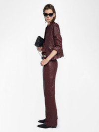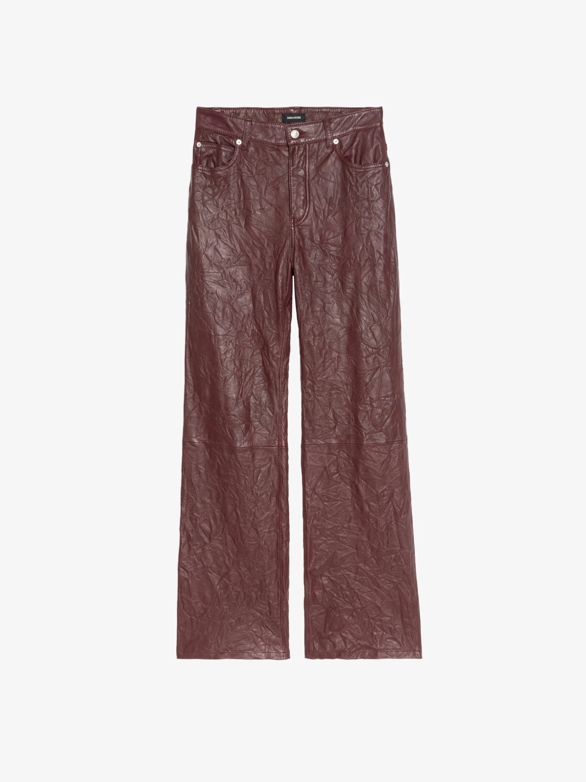Wide-leg pants in crinkled leather with multiple pockets. Description & details - Wide-leg pants in crinkled leather - Patch pockets, jean pockets - Zip closure, press stud and belt loop - High waist - Regular fit - Iconic material of Zadig&Voltaire, the crinkled leather is obtained through a multi-step process imagined by the house and guaranteeing a unique product with exceptional craftsmanship. Model is 180 cm / 5' 10" and is wearing a size S This item is true to size. We recommend buying your usual size. Composition 100% Lambskin Care Do not expose your item to a source of heat or to sunlight for a prolonged period. In the event of accidental exposure to water, leave your item to dry at room temperature, away from direct light. To maintain the shine of your smooth or crumpled leather item, use a leather cream or polish. If your item needs cleaning, we recommend contacting a leather specialist. Product code: RWPA00069_BURGUNDY