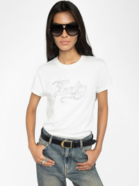 Short-sleeved T-shirt with "Zadig" embroidery with strass on the front. Description & details - T-shirt in 100% cotton - "Zadig" embroidery with strass on the front - Round neck - Short sleeves This item fits true to size. Choose your usual size. Composition 100% Cotton* Care - Machine-wash inside out on a 30°C delicate cycle with similar colours - Air dry - Iron inside out at a maximum of 110°C, avoiding any customised details Product code: JWTS02835_ECRU