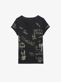 Short-sleeved Tunisian with multi-custom rhinestone customization. Description & details - Cotton Tunisian T-shirt - Rhinestone patterns - Tunisian collar with 5 buttons - Short sleeves and raw edges Model is 176 cm / 5' 9" and is wearing a size S This item is true to size. We recommend buying your usual size. Composition 100% Cotton** Care - Machine-wash inside out on a 30°C delicate cycle with similar colours - Air dry - Iron inside out at a maximum of 110°C, avoiding any customised details Product code: JWTN02633_BLACK