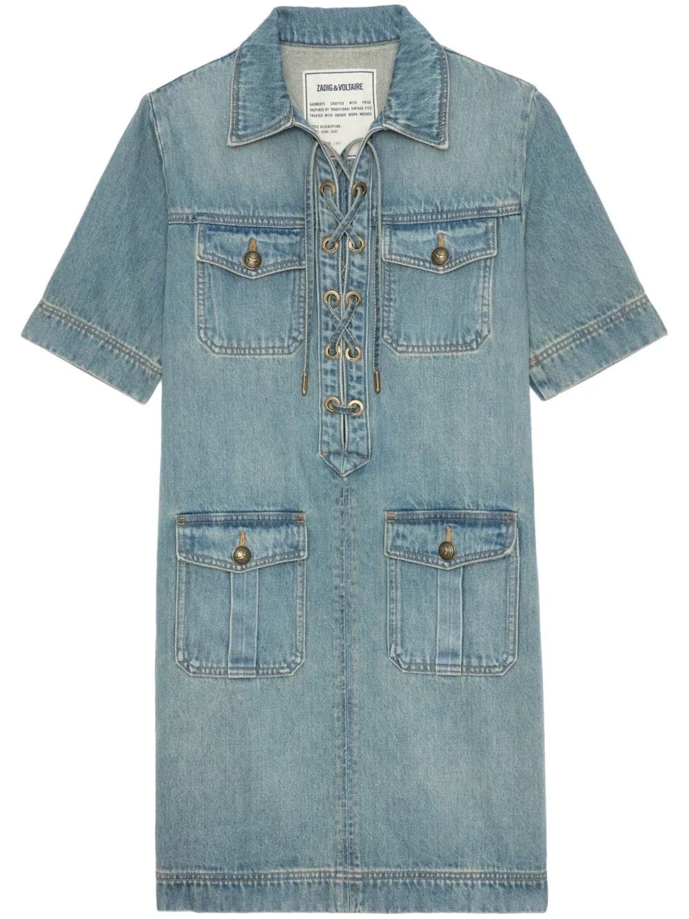 denim mini dress Highlights - Powder blue - Front tie fastening - Four front flap pockets - Classic collar - Short sleeves Imported Composition Organic Cotton 100%