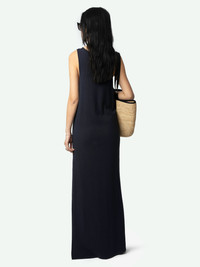 A seamless mix of soft structure and free-spirited ease, the Deva is cut from washed cotton and linen in deep Encre, giving the navy sleeveless dress a lived-in drape without losing polish. The design is fully reversible: wear the clean V-neck to the front for understated minimalism or flip it for a subtler edge. High side slits let the ankle-grazing skirt move easily on hot streets or seaside boardwalks, and the breathable fabric keeps its cool from day to late night. Description & details - Mid-length washed cotton-linen navy sleeveless dress with reversible construction - Deep V neckline; turn inside out for an alternate look - Sleeveless cut and lightweight fabric keep the navy sleeveless dress cool in warm weather - Side slits add fluid movement and showcase statement footwear - Relaxed fit skims the body; style with or without a belt for varied silhouettes Model is 171 cm / 5' 7" and is wearing a size S This item is true to size. We recommend buying your usual size. Composition 70% Cotton** 30% Linen Care - Machine-wash inside out on a 30°C delicate cycle with similar colours - Air dry - Iron inside out at a maximum of 110°C, avoiding any customised details Product code: JWDR01079_ENCRE