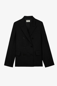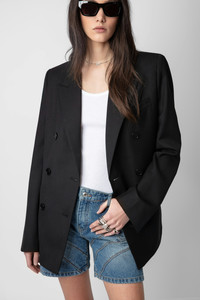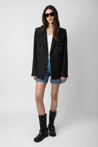 Oversized black wool blazer with tailored collar, button closure and shoulder pads. Description & details - Women’s black oversized, straight-cut wool blazer - Pointed collar and shoulder pads - Double-breasted closure - Distressing and rip on back - 2 flap pockets and 1 piped pocket on the chest - Long sleeves, mitred cuffs and vent at the back Composition 55% POLYESTER 45% VIRGIN WOOL Product code: WWBL00851_NOIR