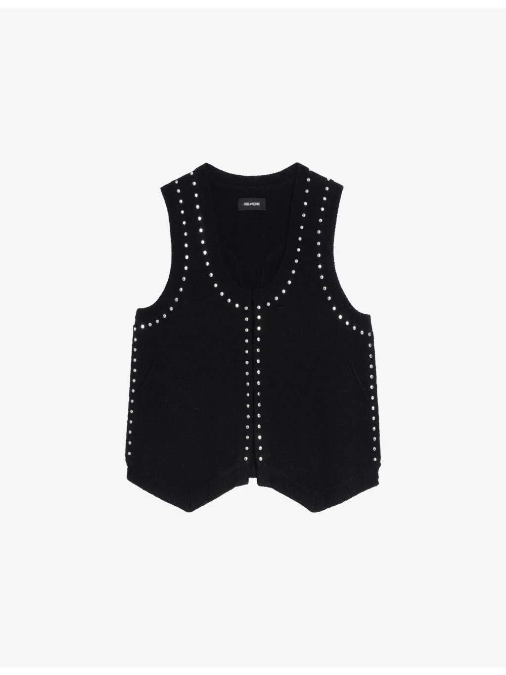 PRODUCT DETAILS - Zadig&Voltaire wool and cashmere-blend waistcoat - 90% merino wool, 10% polyester - Safety pin fastening at front - Regular fit, round neck, sleeveless, stud embellishment - Hand wash - True to size - Model is 5ft 10in/1.78m and wears a size small - Midweight, non-stretch Ref: R04547028
