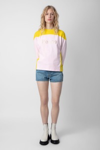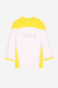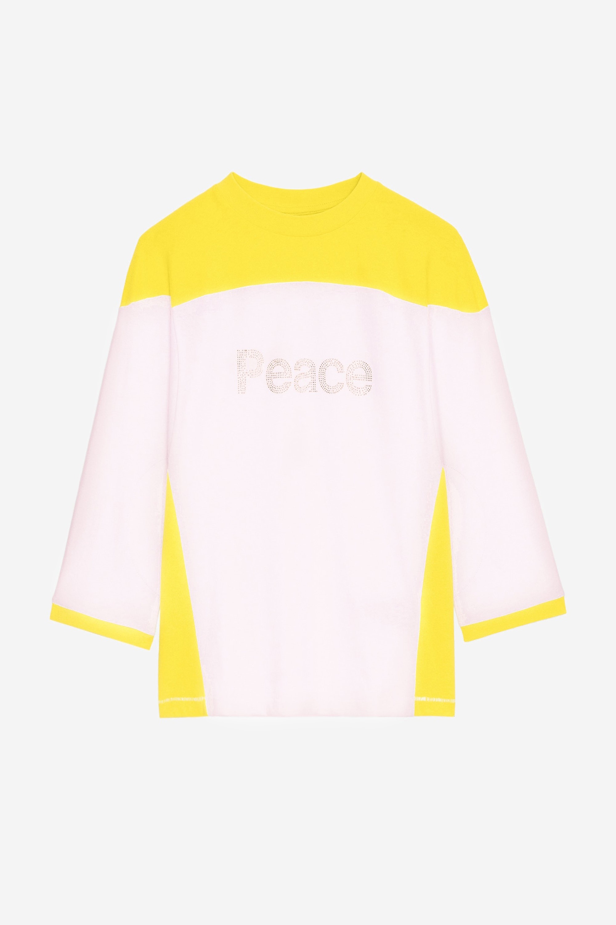 Women's short-sleeved yellow and ecru cotton T-shirt with contrasting print, peace slogan and diamanté detail. Description & details - Women's loose-fit Sun yellow and ecru cotton T-shirt - Round neck - 3/4 sleeves - Contrasting sleeves and shoulders - Peace slogan with diamanté detail Model is 175 cm / 5' 8" and is wearing a size S If you’re between two sizes, we recommend choosing the smaller size. Composition 100% COTTON** Care Wash your T-shirt inside out, in a mesh laundry bag, for a delicate wash at a maximum of 86°F and 800 rpm. The spin cycle speed should not exceed 400 rpm if the T-shirt is customized. Iron your T-shirt on a low heat setting inside out, to avoid direct contact between the iron and the customized details. Product code: JWTS01551_SUN