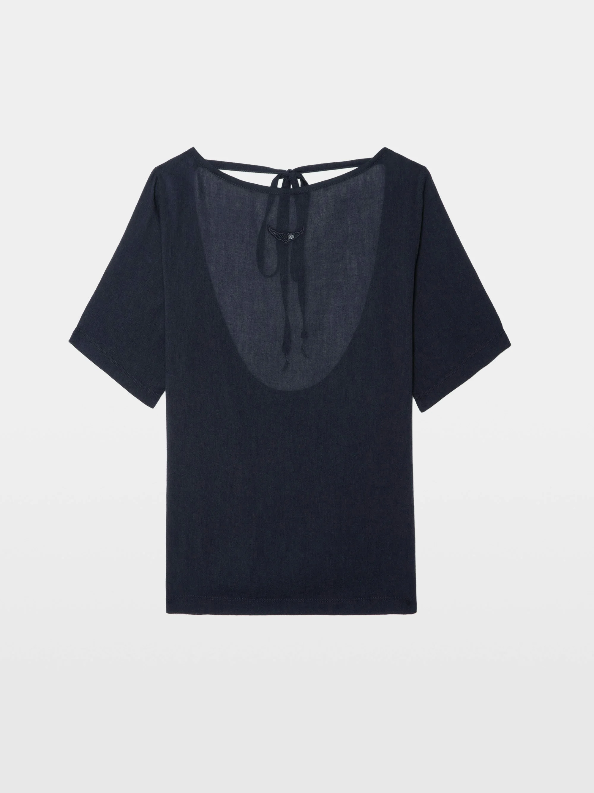 Short-sleeved T-shirt with open back and drawstring with wing charms. Description & details - Cotton gauze T-shirt - Boat neck - Wing signature on the front - Short sleeves - Open back and drawstring with wing brooch Model is 175 cm / 5' 8" and is wearing a size S This item has a loose fit. For a more fitted look, choose one size down from your usual size. Composition 53% Cotton* 47% Viscose Care - Machine-wash inside out on a 30°C delicate cycle with similar colours - Air dry - Iron inside out at a maximum of 110°C, avoiding any customised details Product code: JWTS02830_ENCRE