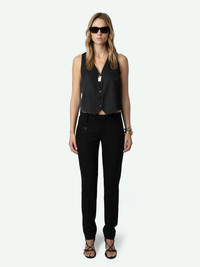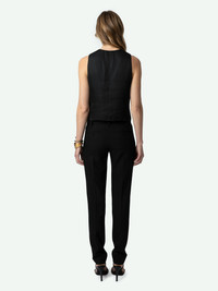 Sleeveless V-neck button-up black satin vest. Description & details - Women’s black satin waistcoat-inspired top - V-neckline - Button fastening - One welt chest pocket - Sleeveless Model is 175 cm / 5' 8" and is wearing a size S This item is true to size. We recommend buying your usual size. Composition 57% POLYESTER** 43% POLYESTER Care - Hand-wash or machine-wash inside out in a mesh laundry bag on a 20°C delicate cycle with a maximum spin speed of 400 rpm - Air dry flat - Iron inside out at a maximum of 110°C Product code: WWTO00225_NOIR