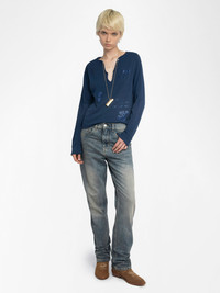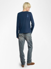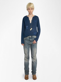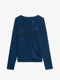 Long-sleeved Henley T-shirt with multi-custom rhinestones. Description & details - Henley T-shirt in 100% cotton - Henley collar with 5 buttons - Long sleeves - Rhinestone details on front and back Model is 180 cm / 5' 10" and is wearing a size S This item fits true to size. Choose your usual size. Composition 100% Cotton** Care - Machine-wash inside out on a 30°C delicate cycle with similar colours - Air dry - Iron inside out at a maximum of 110°C, avoiding any customised details Product code: JWTN02643_BLUEBERRY