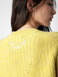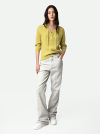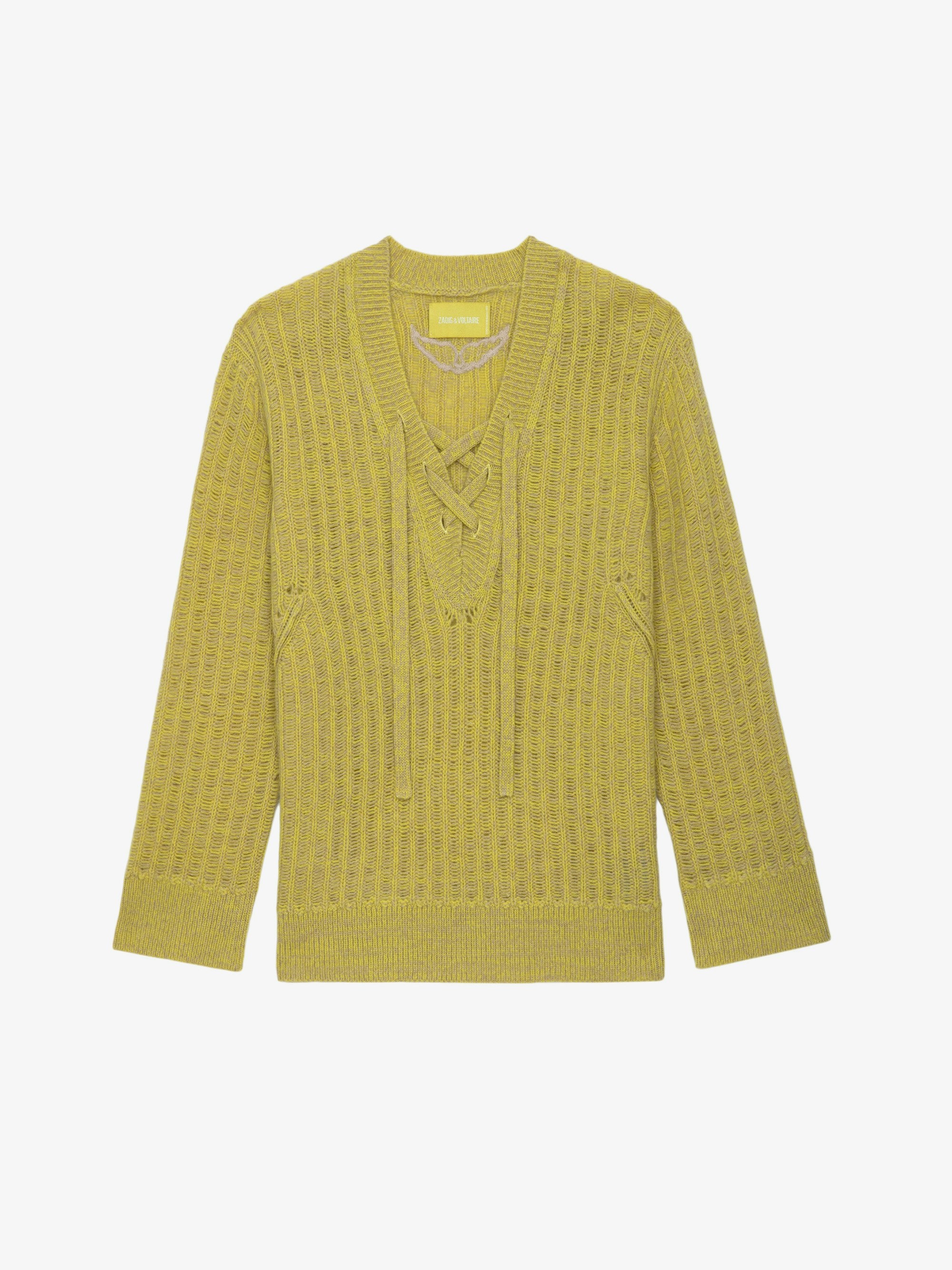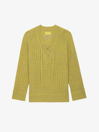 Light yellow merino wool sweater with openwork details, long sleeves and drawstring ties. Description & details - Women’s light yellow merino wool sweater - Openwork details - V neckline and drawstring ties - Long sleeves, pointelle ZV signature and ribbed trim Model is 178 cm / 5' 10" and is wearing a size S This item is true to size. We recommend buying your usual size. Composition 100% WOOL MERINOS* Care - Hand-wash or machine-wash on a 20°C wool cycle with a maximum spin speed of 400 rpm - Do not wring - Air dry flat - Iron inside out at a maximum of 110°C, avoiding any customised details Product code: KWSW01602_JAUNE