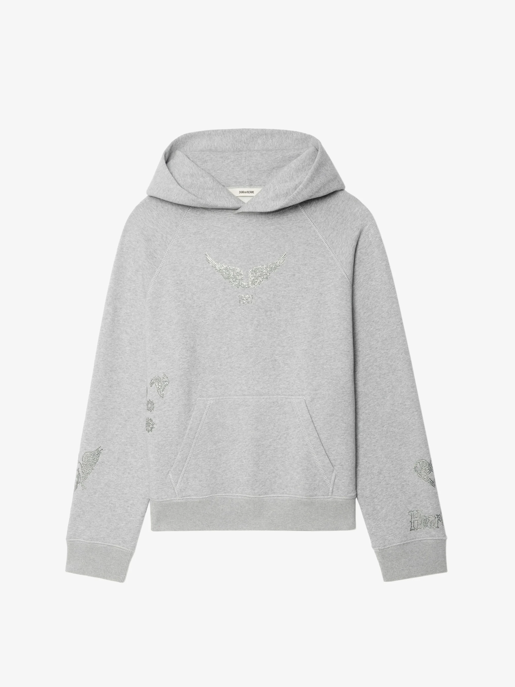 Long-sleeved hooded sweatshirt with multi-rhinestone customization. Description & details - Sweatshirt in 100% cotton - Multi-coloured print with rhinestones - Hood - Long sleeves Model is 177 cm / 5' 9" and is wearing a size S This item fits true to size. Choose your usual size. Composition 100% Cotton** Care - Machine-wash inside out on a 30°C delicate cycle with similar colours - Air dry - Iron inside out at a maximum of 110°C, avoiding any customised details Product code: JWSS01665_GRIS CHINE