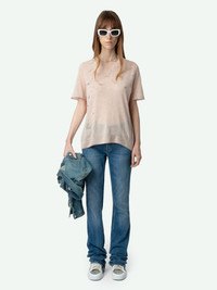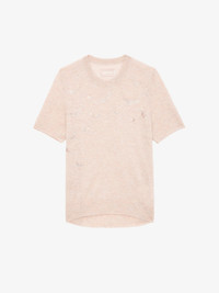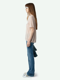 Short-sleeved pale pink feather cashmere sweater with diamante wings in a color gradient on the front. Description & details - Women’s Sweet pale pink feather cashmere sweater - Wings embellished with diamante in a color gradient on the front - Round neck - Short sleeves with rolled and ribbed edges - Pointelle ZV signature at the bottom - Naturally warm feather cashmere is lighter and more delicate than traditional cashmere. It offers a finer knit, making this an exceptional piece. This item is true to size. We recommend buying your usual size. Composition 100% CASHMERE Care - Hand-wash or machine-wash on a 20°C wool cycle with a maximum spin speed of 400 rpm - Do not wring - Air dry flat - Iron inside out at a maximum of 110°C, avoiding any customised details Product code: KWSW01674_SWEET