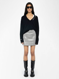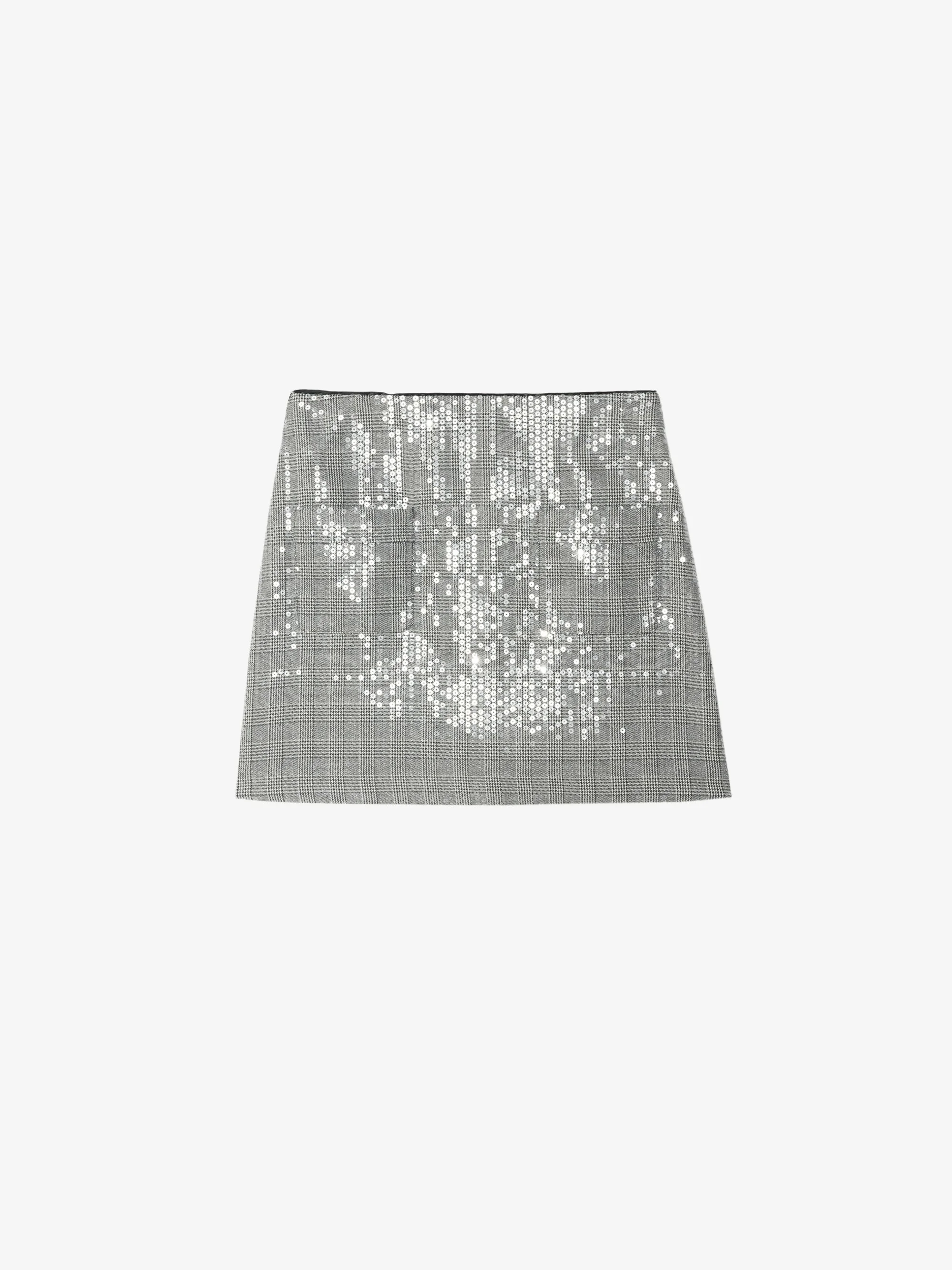 Short straight tailored skirt with sequins, patch pockets at the front and zip fastening at the back. Description & details - Short straight tailored skirt - Sequins - Zip fastening at the back - 2 patch pockets at the front - Topstitching Model is 180 cm / 5' 10" and is wearing a size S This item fits true to size. Choose your usual size. Composition 63% Polyester** 33% Viscose 2% Elasthanne 2% Metallic fiber Care This garment should be dry-cleaned only. Product code: WWSK01616_BLACK
