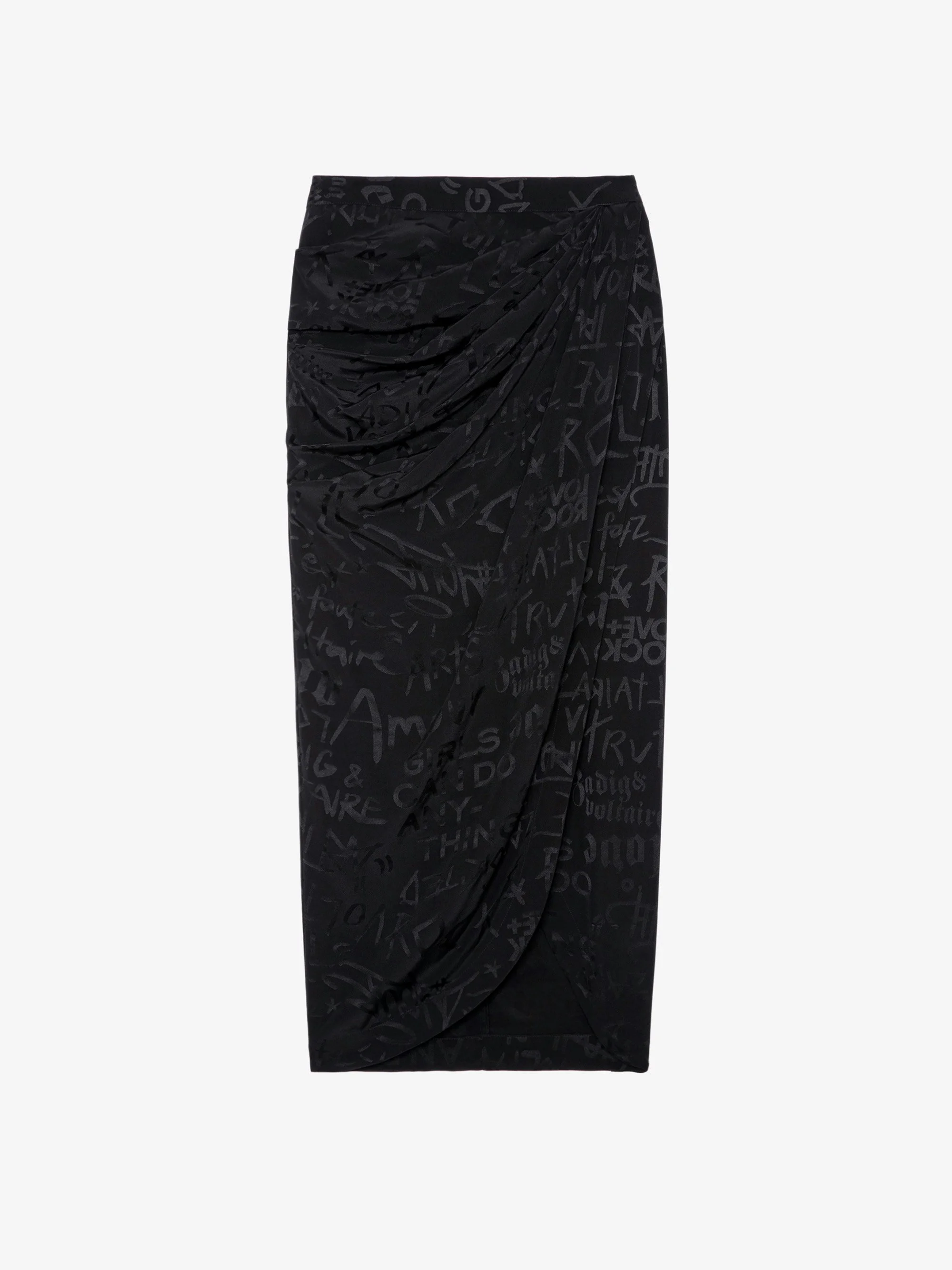 Long draped black silk skirt. Description & details - Women’s long black skirt - Jacquard silk with Zadig&Voltaire manifesto - Draped and slit at front - Zip fastening at the back Model is 170 cm / 5' 6" and is wearing a size 36 If you’re between two sizes, we recommend choosing the larger size. Composition 100% SILK Care Hand-wash or machine-wash your garment at a maximum of 20 °C, in a mesh laundry bag and inside out, with a gentle spin cycle. Air-dry. Iron your garment on a low heat setting or steam from a distance of 20 cm, being particularly careful with customised details. Product code: WWSK00363_NOIR