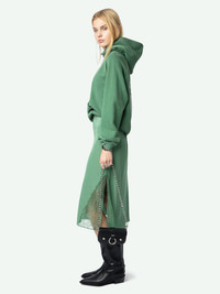 Lingerie-style silk midi skirt with lace trim. Description & details - Coriander green silk lingerie-style mid-length skirt for women - Zip fastening on the side - Side slits adorned with contrasting patterned lace trims Model is 177 cm / 5' 9" and is wearing a size 36 This item is true to size. We recommend buying your usual size. Composition 100% Silk Care - Hand-wash or machine-wash inside out in a mesh laundry bag on a 20°C delicate cycle with a maximum spin speed of 400 rpm - Air dry flat - Iron inside out at a maximum of 110°C Product code: WWSK01564_CORIANDER