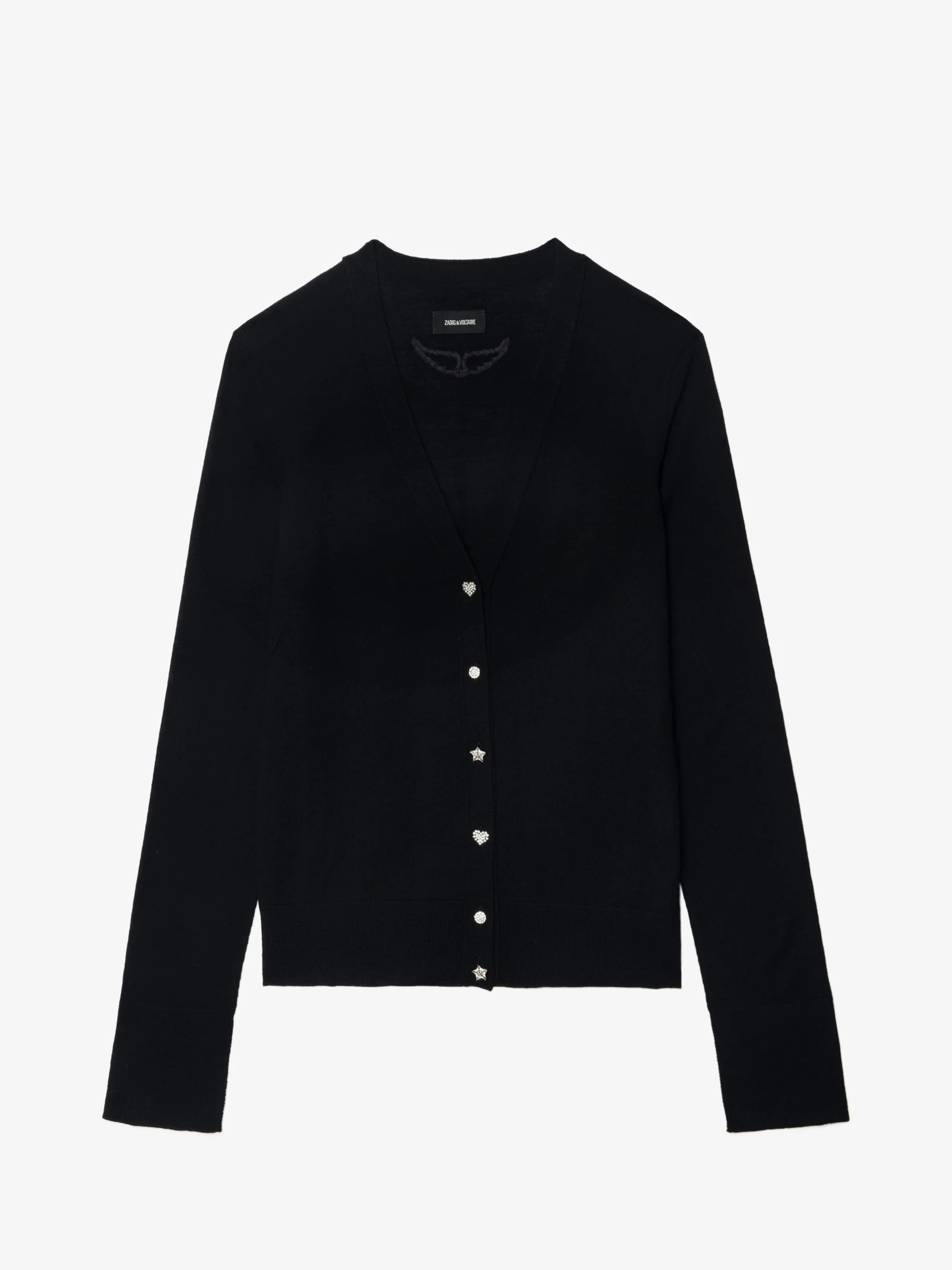 V-neck cardigan with jewel buttons. Description & details - Cardigan in 100% merino wool - V-neck - Button closure with jewel buttons - Long sleeves Model is 178 cm / 5' 10" and is wearing a size S This item is true to size. We recommend buying your usual size. Composition 100% Merino wool* Care - Hand-wash or machine-wash on a 20°C wool cycle with a maximum spin speed of 400 rpm - Do not wring - Air dry flat - Iron inside out at a maximum of 110°C, avoiding any customised details Product code: KWCA00579_BLACK