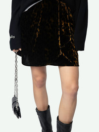Leopard print velvet ruffle mini skirt. Description & details - Cognac Brown velvet short skirt for women - Leopard print - Buttoned wrap-effect fastening - Asymmetrical ruffled panel Model is 177 cm / 5' 9" and is wearing a size 36 This item is true to size. We recommend buying your usual size. Composition 75% Viscose 25% Polyamide** Care - Hand-wash or machine-wash inside out in a mesh laundry bag on a 20°C delicate cycle with a maximum spin speed of 400 rpm - Air dry flat - Iron inside out at a maximum of 110°C Product code: WWSK01558_COGNAC