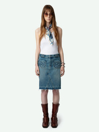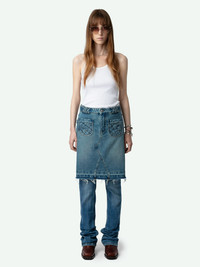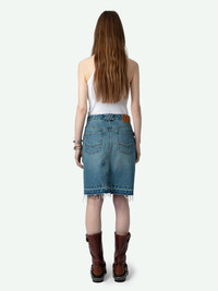 Faded blue denim mini skirt with pockets, braided details and raw edges. Description & details - Women’s Light Blue faded denim mini skirt - Zip and button fastening and braided belt loops - 2 braided patch pockets on the front and 2 patch pockets on the back - Frayed edges, side strap with metal ring and brand label embossed with ‘Zadig Denim’ on the back Model is 175 cm / 5' 8" and is wearing a size S If you’re between two sizes, we recommend choosing the larger size. Composition 100% COTTON* Care - Machine-wash inside out on a 30°C delicate cycle with similar colours - Air dry - Iron inside out at a maximum of 150°C, or in case of customised details, at a maximum of 110°C avoiding the customised details Product code: WWSK00400_LIGHT BLUE