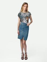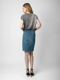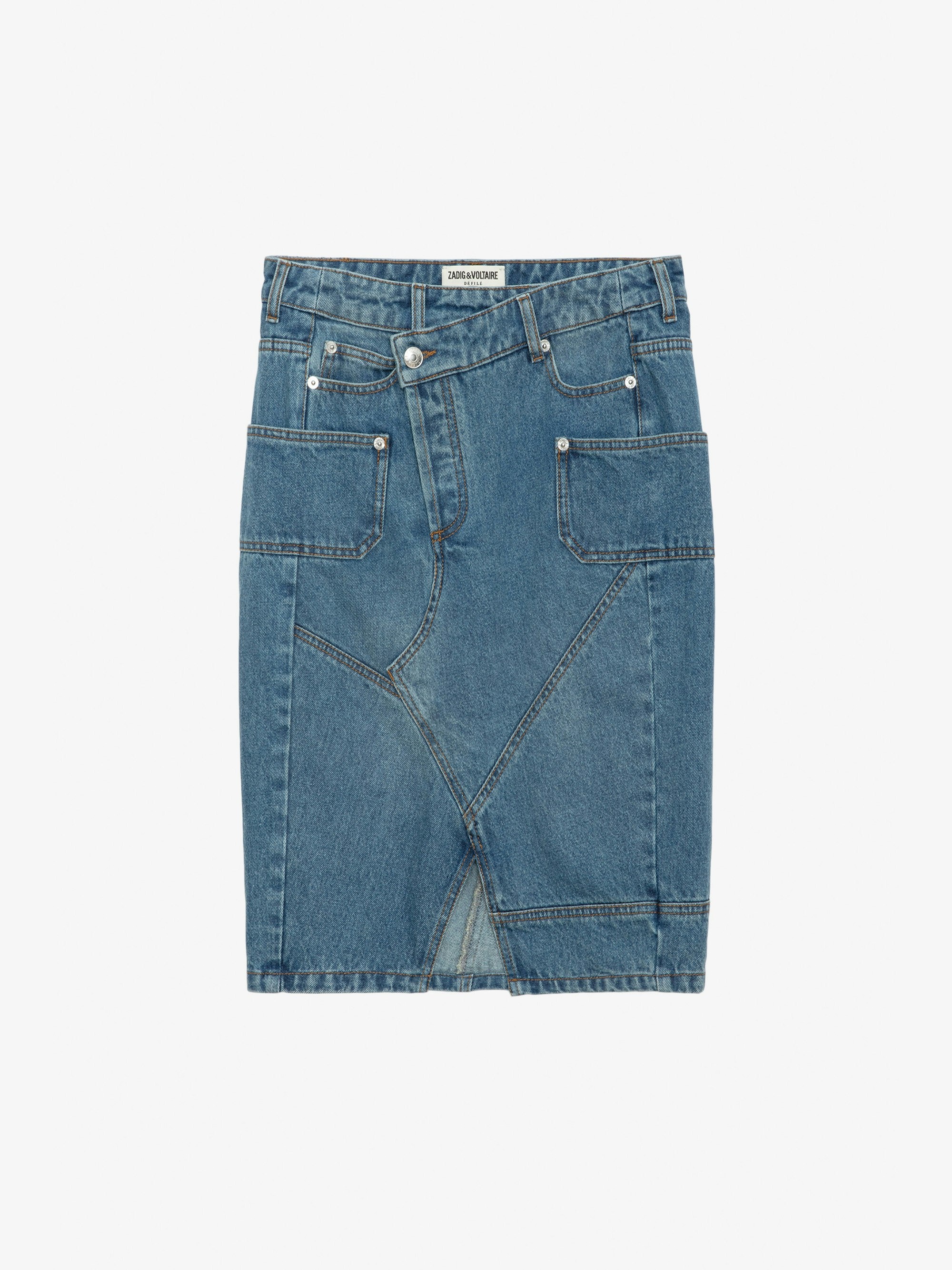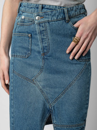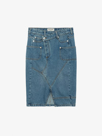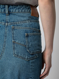Faded denim midi skirt with asymmetric fly, split, pockets and panels. Description & details - Women’s faded Light Blue denim structured midi skirt - Asymmetric zip and button fly and belt loops at the waist - Front split and couture details - 5 pockets with panels and “Zadig Denim” leather jacron on the back Model is 178 cm / 5' 10" and is wearing a size 36 If you’re between two sizes, we recommend choosing the smaller size. Composition 100% COTTON** Care - Hand-wash or machine-wash inside out in a mesh laundry bag on a 20°C delicate cycle with a maximum spin speed of 400 rpm - Air dry flat - Iron inside out at a maximum of 110°C Product code: WWSK00366_LIGHT BLUE