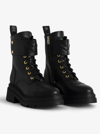 Ranger boots with a strap adorned with embossed leather wings. Description & details - High-rise ranger boots in smooth black leather for women - Inner zip closure and laces - Strap adorned with an embossed smooth leather wing at the front and textile tab signed Zadig&Voltaire at the back - Tonal stitching and gold signature metal wings at the back - Treaded sole - Heel height: 7.5 cm - Made in Portugal If you’re between two sizes, we recommend choosing the smaller size. Composition 100% Calfskin Care - Protect your leather item from humidity and any source of heat (radiator, sun) - Avoid your item coming into contact with water - Regularly maintain the shine of your smooth or grained leather shoes with a leather polish Product code: SWCT01979_NOIR
