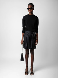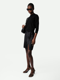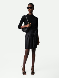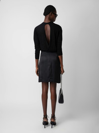 Black satin miniskirt with pleats, split and tie at the waist. Description & details - Women’s black flowing satin miniskirt - Pleat details, split and asymmetric cut - Tie at the waist and zip fastening at the back Model is 177 cm / 5' 9" and is wearing a size S This item is true to size. We recommend buying your usual size. Composition 57% POLYESTER** 43% POLYESTER Care - Hand-wash or machine-wash inside out in a mesh laundry bag on a 20°C delicate cycle with a maximum spin speed of 400 rpm - Air dry flat - Iron inside out at a maximum of 110°C Product code: WWSK00368_NOIR