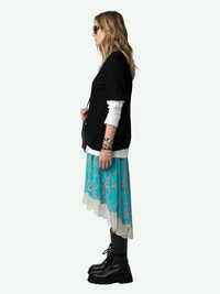 Blue lingerie-style asymmetrical mid-length silk skirt with ZV chain motifs and lace. Description & details - Women’s Aqua blue lingerie-style silk midi skirt - Chain and ZV signature motifs and lace strips - Asymmetrical design that is shorter at the front - Elasticated waist and back Model is 175 cm / 5' 8" and is wearing a size 36 This item is true to size. We recommend buying your usual size. Composition 100% SILK Care - Hand-wash or machine-wash inside out in a mesh laundry bag on a 20°C delicate cycle with a maximum spin speed of 400 rpm - Air dry flat - Iron inside out at a maximum of 110°C Product code: WWSK00402_AQUA