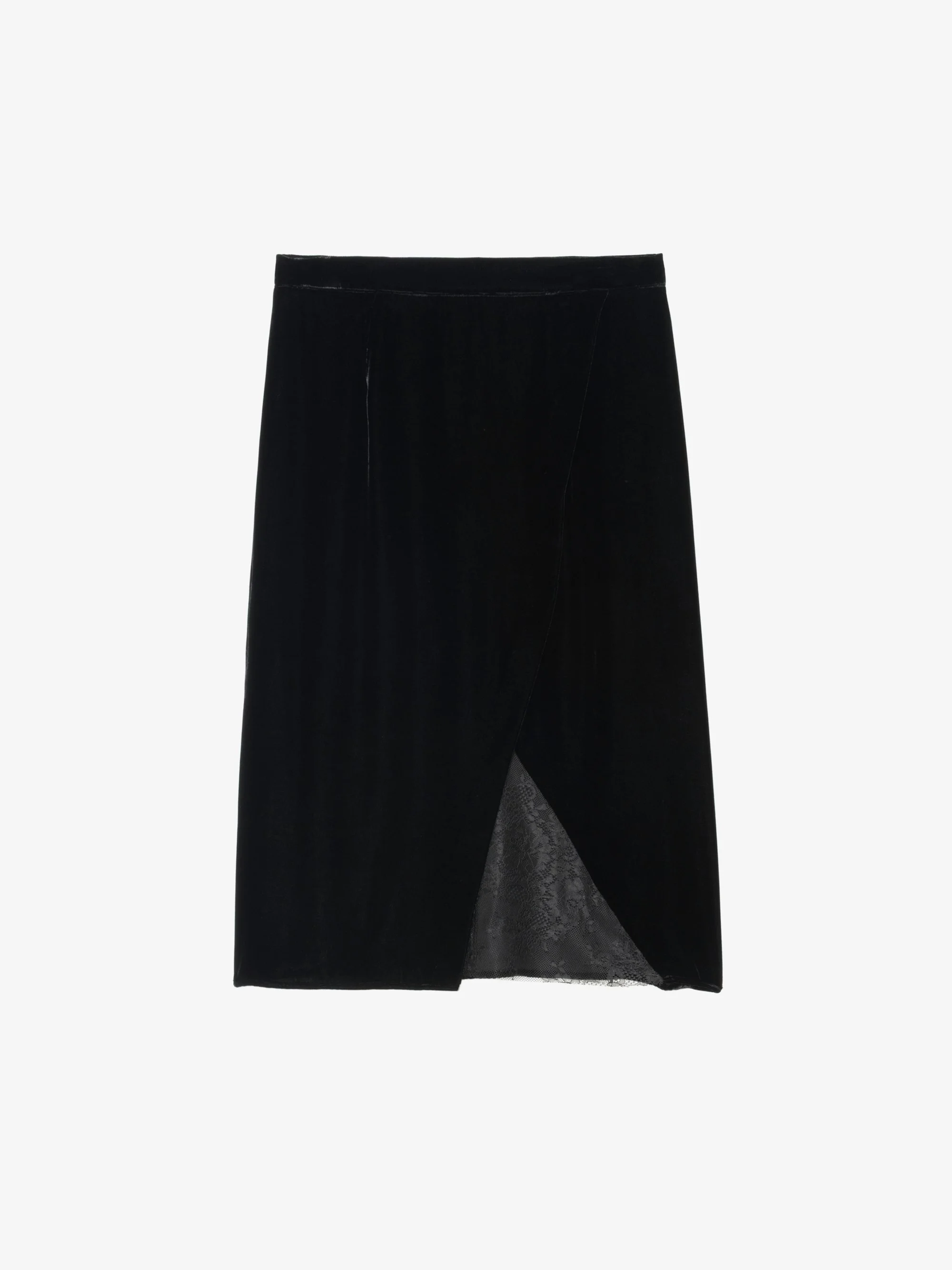 Mid-length velvet skirt with lingerie inspiration featuring lace and wrap cut. Description & details - Mid-length velvet skirt with lingerie inspiration - Lace on opening - Back zip closure - Fluid wrap cut Model is 177 cm / 5' 9" and is wearing a size 36 This item fits true to size. Choose your usual size. Composition 80% Viscose** 20% Silk Care - Hand-wash or machine-wash inside out in a mesh laundry bag on a 20°C delicate cycle with a maximum spin speed of 400 rpm - Air dry flat - Iron inside out at a maximum of 110°C Product code: WWSK01610_BLACK