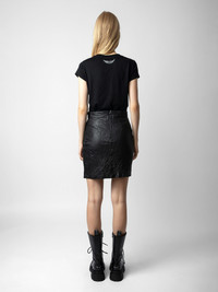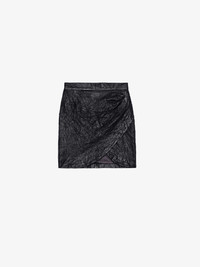 Women's short black crinkled leather skirt with wallet effect. Description & details - Women's short black crinkled leather skirt - Wrap style - Zipped back closure Model is 177 cm / 5' 9" and is wearing a size S This item is true to size. We recommend buying your usual size. Composition 100% LAMBSKIN Care Protect from light and humidity. Avoid any abrasive surface. Have cleaned by a leather specialist. Product code: RWSK00004_NOIR