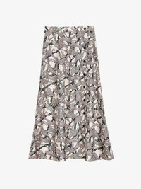 Mid-length skirt in ecru silk twill with leopard and chain print and button fastening. Description & details - Women's ecru silk twill mid-length skirt - High-waisted - Wild Chains print - Asymmetrical button fastening along the length - Flared hem and front slit - Elasticated waist and back Model is 178 cm / 5' 10" and is wearing a size 36 This item is true to size. We recommend buying your usual size. Composition 100% Silk Care - Hand-wash or machine-wash inside out in a mesh laundry bag on a 20°C delicate cycle with a maximum spin speed of 400 rpm - Air dry flat - Iron inside out at a maximum of 110°C Product code: WWSK00397_ECRU