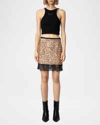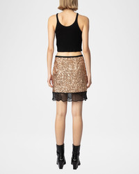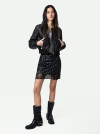 Short black skirt with elasticated waist, sequins and lace trim. Description & details - Women’s short black skirt - Sequins and lace band - Elasticated waist Model is 179 cm / 5' 10" and is wearing a size 36 This item is true to size. We recommend buying your usual size. Composition 100% POLYESTER Care This garment should be dry-cleaned only. Product code: WWSK00384_NOIR