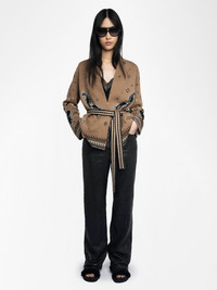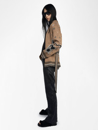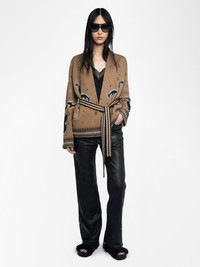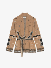 The Kala cardigan in warm brown Merino drapes you in effortless elegance—with a touch of rock. A laid-back silhouette meets refined detail, creating the perfect layer for when you want to look undone, on purpose. Ribbed trims, buttoned front, and an attitude that never tries too hard. Description & details - Cardigan in 100% merino wool - Fringe along hemline and sleeve cuffs - Modern jacquard pattern - Wrap closure with belt - Long sleeves Model is 178 cm / 5' 10" and is wearing a size s This item fits true to size. Choose your usual size. Composition 100% Merino wool* Care - Hand-wash or machine-wash on a 20°C wool cycle with a maximum spin speed of 400 rpm - Do not wring - Air dry flat - Iron inside out at a maximum of 110°C, avoiding any customised details Product code: KWCA01638_DAIM