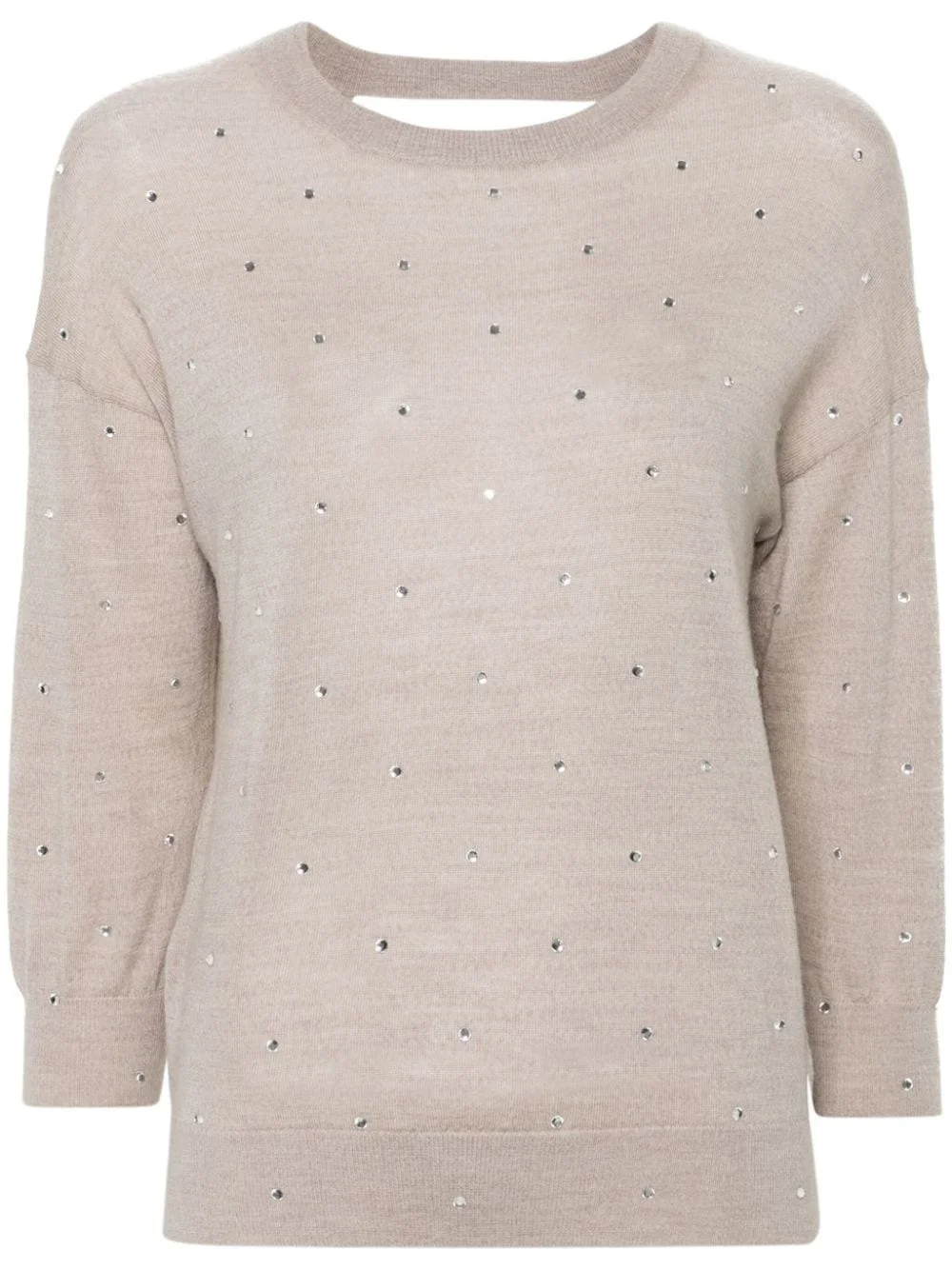 Kansy knittted wool jumper Highlights - Light brown - Merino wool - Knitted construction - Rhinestone embellishment - Round neck - Long sleeves - Ribbed cuffs and hem - V-back - Straight hem Imported Composition Merino 100% SIZE & FIT Model measurements Height 5 ft 10 in(1.77 m) Bust/Chest 33.07 in(84 cm) Hips 37 in(94 cm) Waist 24.8 in(63 cm) FittingInformation Designed for a relaxed fit, this piece allows for comfort and movement when worn The ribbed hem offers a close, comfortable fit Made with a midweight knit, this piece offers some stretch This piece fits true to size – take your usual size Washing instructions Hand Wash