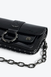 Women’s black iguana-embossed patent leather mini bag with metal chain. Description & details - Women’s Kate Wallet bag in black iguana-embossed patent leather - Black cotton lining - Metal ring with “Kate Loves Zadig&Voltaire” engraving and studded trim - Removable metal chain - Flap with magnetic closure - Two compartments separated by a zipped pocket - Carry by hand, over the shoulder or across the body using the leather loop - Made in Italy Height x Width x Length: 3.3 x 6.3 x 1.2 in. Composition 100% CALFSKIN Care - Protect your leather item from humidity and any source of heat (radiator, sun) - Avoid your item coming into contact with water - Regularly care for your leather item using a colourless nourishing cream for leather, suitable for leather goods - Ensure you wear your item with similar colours - Avoid overfilling your bag to ensure its durability - In case of stains, contact a leather professional Product code: LWBA02395_NOIR
