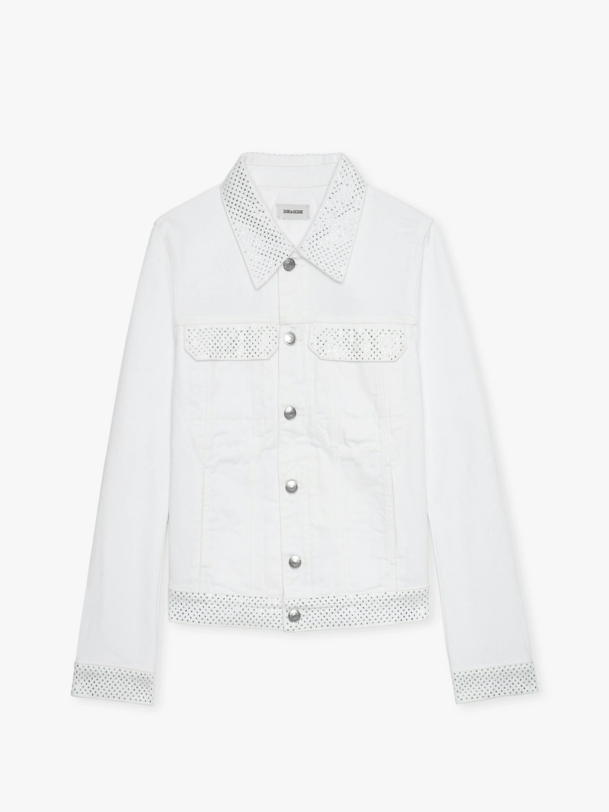 A crisp riff on the classic silhouette, the Kioky is a womens white denim jacket cut close in rigid cotton twill. Tonal topstitching keeps the lines sharp, while hand-set rhinestones trace the collar, pockets, and hem for understated sparkle. Metal buttons secure the placket and cuffs, and the cropped length slips easily over high-waist denim or a silk slip dress, giving this womens white denim jacket an effortless day-to-night edge. Description & details - Fitted womens white denim jacket in non-stretch cotton twill - Shirt collar and metal button fastening through the front - Hand-set rhinestones along collar, flap pockets, cuffs, and hem add subtle shine - Two flap chest pockets and two side pockets provide practical storage - Cropped, hip-grazing length with adjustable side tabs for a personalised fit - Women's white denim jacket with button cuffs; tonal topstitching maintains a clean finish Model is 171 cm / 5' 7" and is wearing a size S This item is true to size. We recommend buying your usual size. Composition 100% Cotton Care - Machine-wash inside out on a 30°C delicate cycle with similar colours - Air dry - Iron inside out at a maximum of 150°C, or in case of customised details, at a maximum of 110°C avoiding the customised details Product code: WWOW01678_JUDO