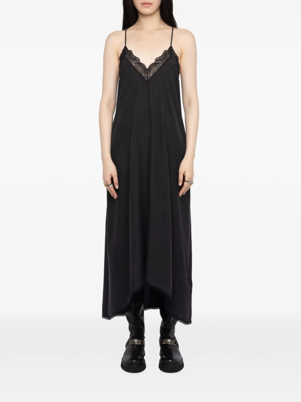 lace-trim midi dress Highlights - Black - Silk - Lace detail - V-neck - Spaghetti straps Imported Composition Silk 100% Washing instructions Hand Wash