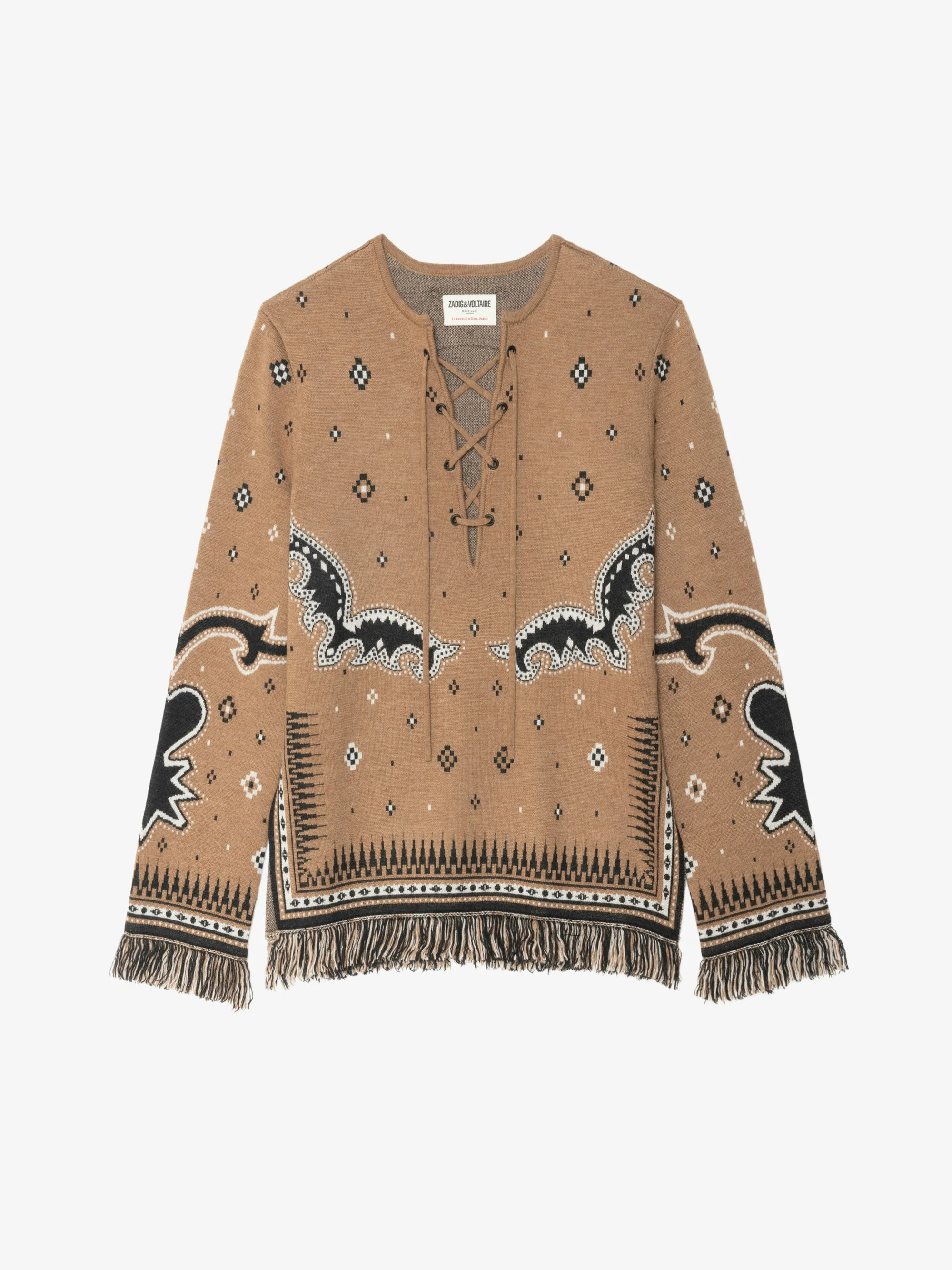 Lace-up sweater with round neck and print. Description & details - 100% merino wool sweater with fringe - Electronic jacquard - Lace-up V-neck - Long sleeves Model is 178 cm / 5' 10" and is wearing a size s This item fits true to size. Choose your usual size. Composition 100% Merino wool* Care - Hand-wash or machine-wash on a 20°C wool cycle with a maximum spin speed of 400 rpm - Do not wring - Air dry flat - Iron inside out at a maximum of 110°C, avoiding any customised details Product code: KWSW02812_DAIM