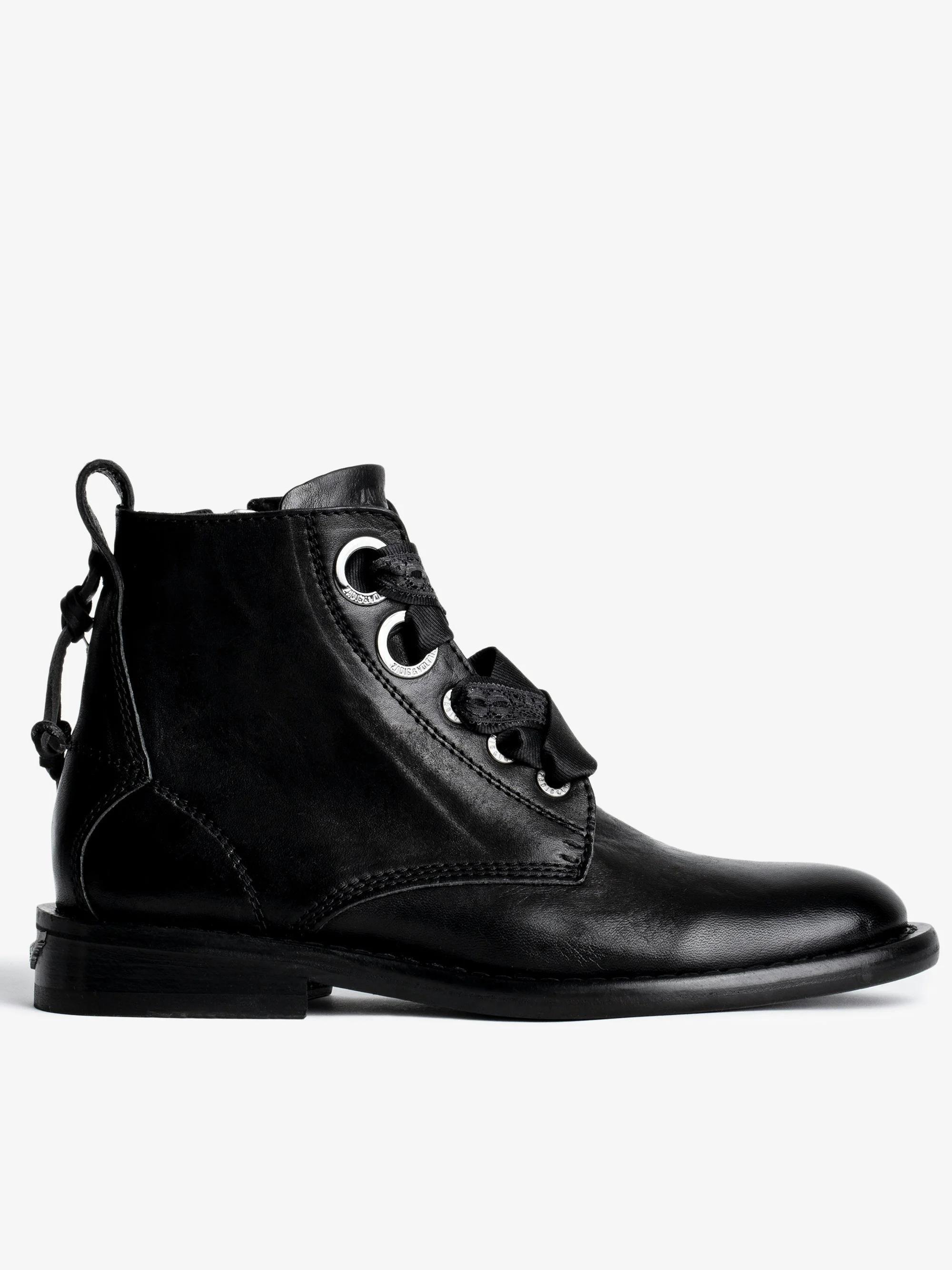 Leather lace-up ankle boots Description & details With skull beads for an added twist, and the Maison’s signature wings, the iconic Laureen Roma ankle boots are the ultimate rock footwear. This is a timeless style that you can wear season after season. - Zadig&Voltaire Women’s ranger boots in black smooth leather - Lace-embellished lacing - Ties with skull beads - Tone-on-tone topstitching - Interior zip closure - Rear tongue - Leather heel embellished with a metallic wings charm - Made in Portugal If you’re between two sizes, we recommend choosing the smaller size. Composition 100% COW LEATHER Care - Protect your leather item from humidity and any source of heat (radiator, sun) - Avoid your item coming into contact with water - Regularly maintain the shine of your smooth or grained leather shoes with a leather polish Product code: PWGAA1702F_NOIR