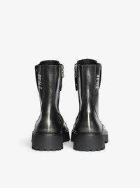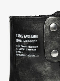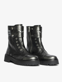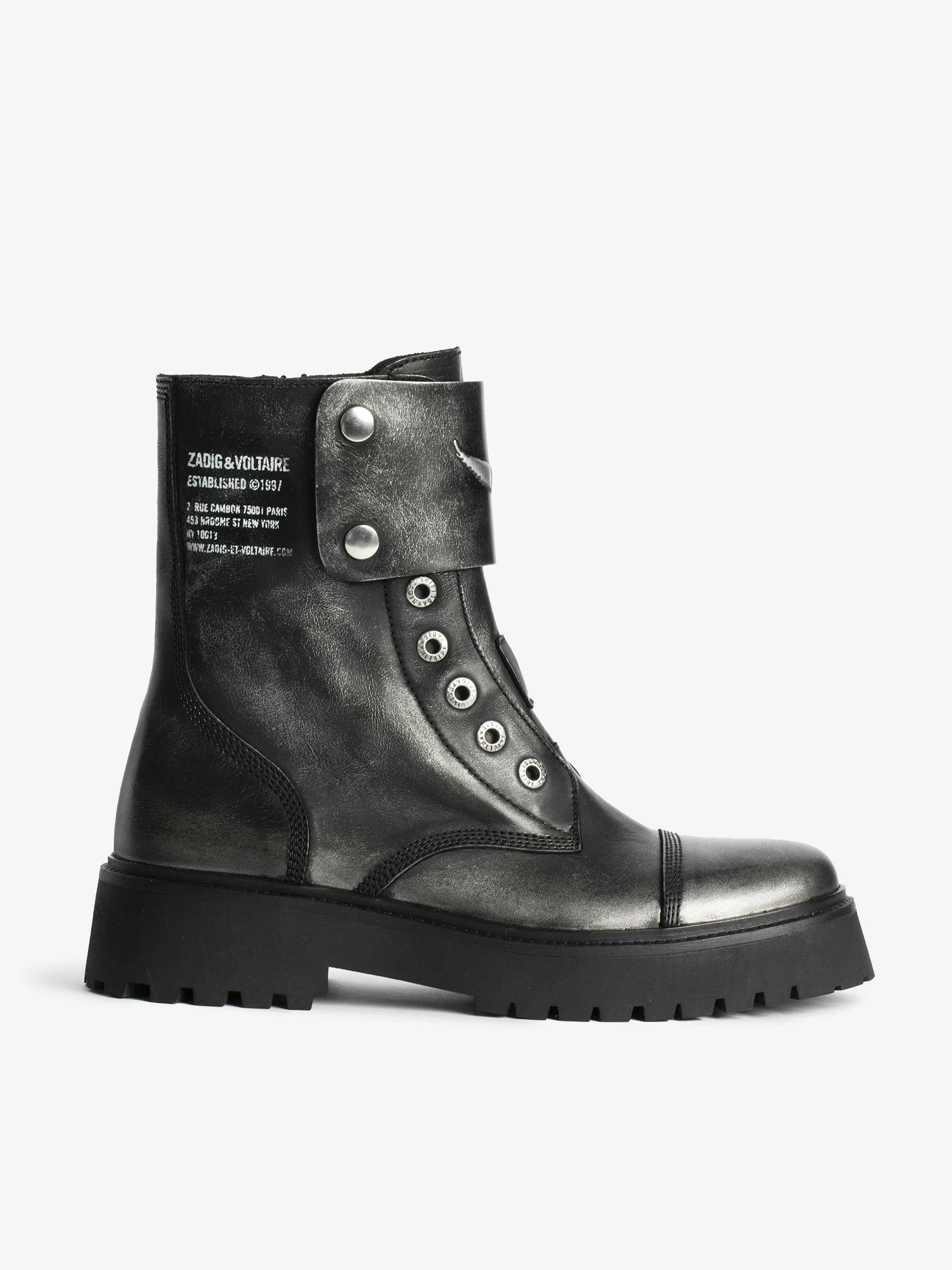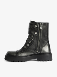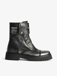 Laceless ranger ankle boots in brush-off effect leather with patches adorned with embossed wings. Description & details - High-top ranger boots in brush-off effect leather - Inner zip closure and laces - Strap adorned with an embossed wing in smooth leather at the front and Zadig&Voltaire signature textile tongue at the back - Tone-on-tone stitching and golden domed wings signature at the back - Lug sole - Heel height: 7.5 cm This model showcases innovative brushed leather, revealing a unique silver shade. Each pair, with its natural nuances, is designed to evolve and develop a patina over time. This item fits true to size. We recommend choosing your usual size. Composition 100% Calf leather Care - Avoid contact or any rubbing with light-colored clothing: color transfer may occur. - Your shoes can be gently cleaned with a soft, dry, and preferably neutral-colored cloth. Do not apply leather conditioner to preserve the bicolored effect. - Store your shoes in their dust bag between each use. Product code: SWCT02055_BLACK
