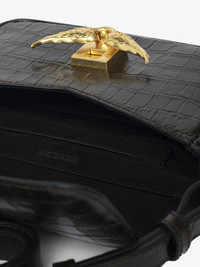 Small croco-effect leather bag with adjustable shoulder strap and signature wings. Description & details - Embossed croco-effect leather bag - Adjustable and removable shoulder strap - Signature wing closure - Interior patch pocket - Can be worn over the shoulder or cross-body 18 x 10.5 x 3.5 cm Composition 100% Cow leather Care - Protect your leather item from humidity and any source of heat (radiator, sun) - Avoid your item coming into contact with water - Regularly care for your leather item using a colourless nourishing cream for leather, suitable for leather goods - Ensure you wear your item with similar colours - Avoid overfilling your bag to ensure its durability - In case of stains, contact a leather professional Product code: LWBA04041_WOOD